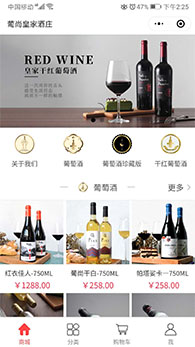 紹興葡尚皇家酒莊小程序是紹興魔方網(wǎng)絡科技有限公司2019年度開發(fā)的微信小程序,小程序頁面設計時尚簡潔,是愛品味紅酒和收藏紅酒購買小程序,開發(fā)了首頁商城、分類、購物車、我的中心等等模塊。